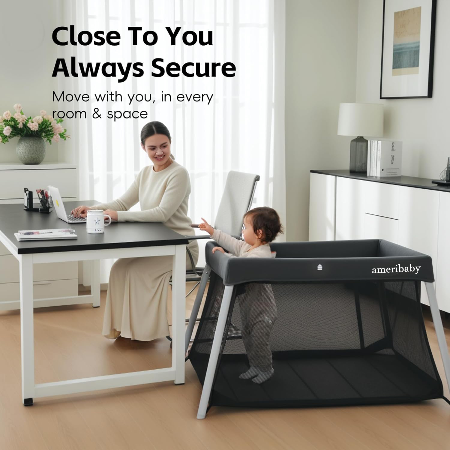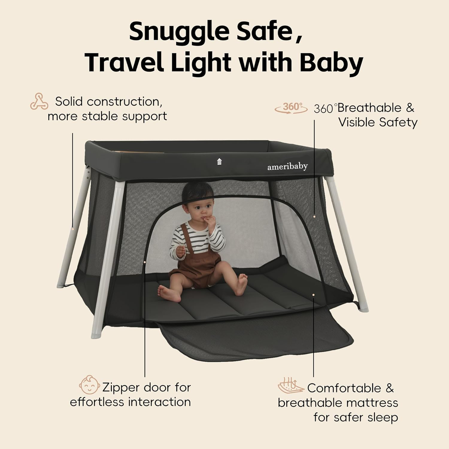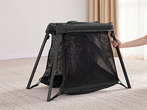 Visual Design: The side of the play crib is made of soft and breathable high-quality mesh fabric, which is detachable and machine washable; The visual design not only allows parents to see the baby but also provides sufficient ventilation to ensure that the baby feels comfortable while playing in the crib; The side zippered door design allows babies to enter and exit easily; Providing a safe and comfortable place for them to sleep and play
